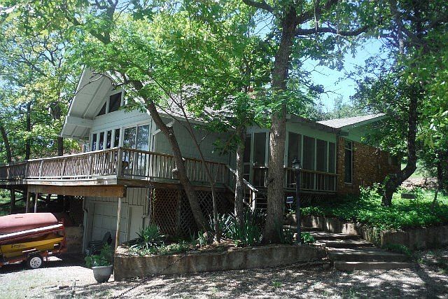 QUAINT AND COZY DESCRIBES THIS LAKE HOME WITH UP CLOSE AND BEAUTIFUL LAKE VIEWS SURROUNDING THE HOME. HOME FEATURES CATHEDRAL CEILINGS; DECORATED LOT AREA; COZY WOOD BURNING FIREPLACE; TWO BEDROOMS WITH PRIVATE SINK AND VANITY AREA IN EACH. LARGE FLOOR TO CEILING WINDOWS IN THE DEN PROVIDE A GRAND VIEW OF THE LAKE AND SURROUNDING HILL COUNTRY. WELCOMING SCREENED-IN PORCH INVITES YOU TO LOUNGE AND READ A BOOK OR TAKE AN AFTERNOON NAP. LOVELY COUNTRY KITCEN THAT HAS AN OPEN CONCEPT TO BREAKFAST/DINE-IN KITCHEN AND FAMILY ROOM. ENORMOUS DECK(HUGE) PROVIDES GREAT OUTDOOR ENTERTAINING. CURRENT HOMOWNERS SPEND A LOT OF TIME OUT HERE WITH THE FAMILY AND GRANDCHILDREN. STORAGE UNDERNEATH THE HOME IN A SINGLE GARAGE. THIS HOME WOULD MAKE A GREAT SINGLE PERSON HOME OR A RETIRED COUPLES HOME....OR THE HOME SIMPLY DESINGED FOR GREAT LAKE HOME LIVING....START YOUR LAKE MEMORIES HERE!!!! BRAND NEW AEROBIC SEPTIC SYSTEM; BRAND NEW HOT WATER TANK.....OWNER WILL CONSIDER LEAVING ALL FURNITURE.