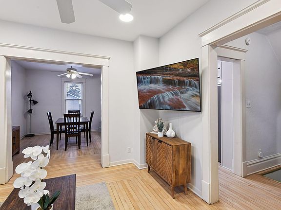Charm, character & modern amenities come together in this 1916 built 2 story farmhouse. Stepping into the front porch, notice the intricate leaded glass, gorgeous details of the entry door and wainscoted ceiling. As you cross the threshold of the home, notice the details of the wood banister to the upper level while the hardwood floors draw you towards the modern main level. The updated, bright kitchen features a center island with gas range, an abundance of counter/cabinet space, updated appliances & large pantry with roll out shelves. The adjacent dining room and living room have large cased openings creating a unified feel while the intricate dovetailed hardwood floors delineate the spaces with their pattern.