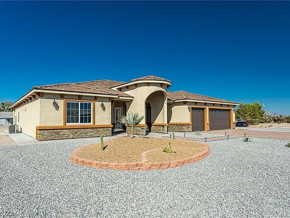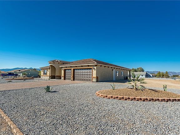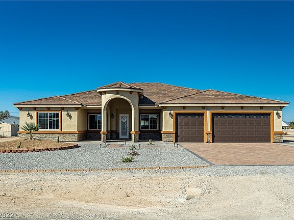 BEAUTIFUL NEW CUSTOM BUILT HOME LOCATED IN PAHRUMP NV - Approx. 2887 sqft. Corner lot close to an acre lot. Home features an Open Floorplan Concept, 3 bedroom each having its own en suite. 4 full baths, 10ft Ceilings, Formal Dining room, Office /Den, Two tone paint, Quartz Counter Tops throughout, lot of cabinet space throughout the kitchen, Kitchen Island, Hugh Walk-In Pantry. Primary bedroom features 12x13 Master Bath with double sinks, jacuzzi tub, dual head custom title shower, 11x13 Walking closet. Exterior Features Stone Veneer, Stamped Concert, Desert landscaping, 771 sqft 3 car garage with utility sink.