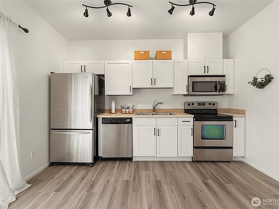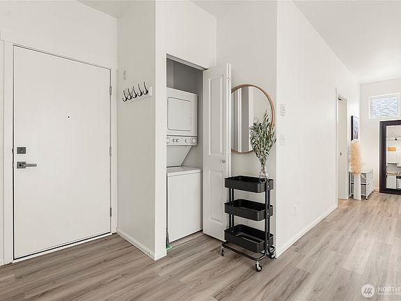 Welcome to the Cozy Condo! This rare top-floor corner unit offers the perfect blend of charm and convenience, with only 10 units in the building for a private, community feel. The bright interior features 9ft ceilings, modern vinyl plank flooring, white cabinetry, and stainless steel appliances. A Queen pull-down Murphy bed and spacious walk-in closet maximize every inch of space. Relax on the oversized balcony with stunning sunset views. Unit comes with off street parking by the entrance, a private yard with skyline views, and outdoor storage. Located in High Point, you're steps from a pond, 20+ acres of open space, and minutes from the West Seattle Bridge, Downtown, and Alki Beach.
