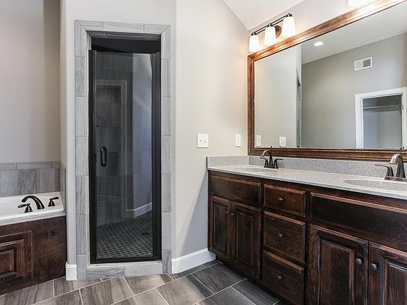 The Camden with 3 car garage. Southern facing beauty with incredible standard features and new entryway layout. Vaulted Master Closet for 3 rows of storage. Walk-in master shower. No cheap, one-piece shower units here, all showers are tiled. Granitex Marble vanity tops. Glass pantry door. Kitchen island with granite or quartz tops. Now is your chance to make selections. Photos of a previous model. Taxes Estimated.