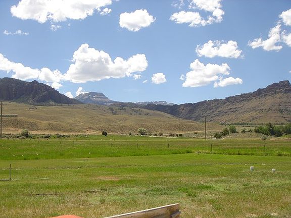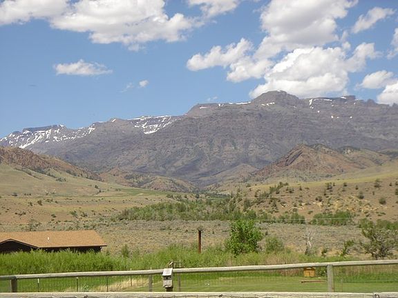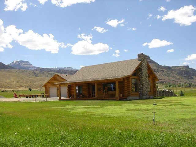 Attractive log home in a picturesque setting with majestic views in every direction. Guest suite is the west part of the detached garage. In the Wapiti Valley near Shoshone Nat'l Forest. Living room has large windows framing the view of Big Creek Drainage.