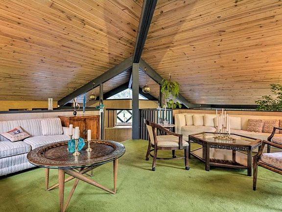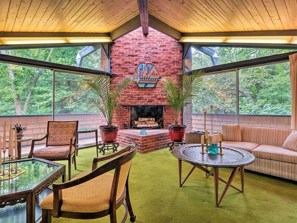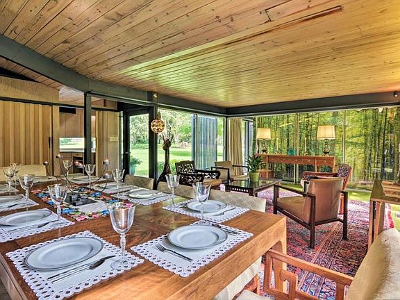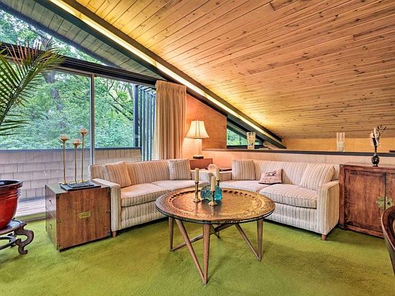 Available January 1! This 3-bed, 2.5-bath home is truly an iconic demonstration of Bruce Goff's architecture! The home features a 2,660-square-foot layout that has maintained its original mid-century modern charm throughout its years. Pics show the house furnished as it was when we offered it as an AirBnB. Since then, we've done some renovations, including new flooring on the lower two levels. It is currently occupied by residents who will be leaving at the end of December. The house sits on 8 secluded acres. You can enjoy seeing deer, birds, raccoons and more. No need for you to mow the extensive lawn. Yard care is provided. Pets are considered on a case-by-case basis. There is no fenced yard. Half of the walls in this house are single-pane glass windows; utilities are higher than in a conventional home. Pets are considered on a case-by-case basis. There is no fenced yard. This house has lots of single-pane glass windows; utilities are higher than average.