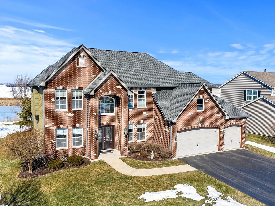 DRESSED TO IMPRESS! Looking for style, beauty & space? Then march into this semi-custom 4 bedroom, 3-1/2 bath home backing to a large pond before it's GONE! First impressions provide a "wow" factor with its bold 2-story brick exterior and grand arched double-door entry. Inside meticulously maintained hardwood floors flow seamlessly throughout the home providing a sleek look with easy maintenance. Highlights include a soaring family room with plenty of natural light, a gas log fireplace, recessed lighting plus a majestic view from the second level catwalk. The stunning oversized gourmet kitchen offers everything today's buyer desires including granite counters, cherry-stained maple cabinets, stainless appliances with not one, but TWO dishwashers, built-in double oven & microwave, wine frig, plus a modern cooktop stove with canopy range hood. A large breakfast bar includes the second dishwasher with additional cabinetry. The generous bayed eating area opens to an over-sized kidney shape concrete patio. Other main level amenities include spacious living & dining rooms, a den/office with French doors overlooking the pond, half bath plus a large tiled laundry room with built-in folding area, convenience sink & plenty of storage. The second level is just as impeccable with gleaming hardwood flooring in ALL the bedrooms and hallway. An expansive master suite features a vaulted ceiling and generous walk-in closet. The luxury bath is perfect for pampering & relaxation. Features include a large vanity with double-bowl sinks, soaker tub and separate custom shower offering TWO shower heads with a seating area. Two secondary bedrooms share a full bath, while a 4th bedroom features an en suite bath. The whole house is serviced by a central vacuum and a built-in surround sound system. Want even more living space? The full deep pour basement has rough-in bath offering plenty of finishing options. Outside enjoy the tranquility of the open pond & scenic skies from the vast patio and open yard. A few other updates include a new water softener (2019) & a newer roof (2014). Great location plus easy access to community amenities and nearby tollway. Hurry in, this one WON'T LAST!