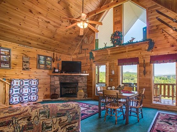 Just a short distance from Pigeon Forge, this cabin feels secluded while still offering easy access to the conveniences of town. Great Smoky Mountains National Park is located just to the south, perfect for lovers of the great outdoors. Rustic and traditional, this cabin is ready to welcome you after a long day of traveling. Step inside and admire the vaulted ceilings and the large wall of windows that allow light to suffuse the space. The cabin's living area features comfy furnishings and a seasonal stone gas fireplace (available October through March). Kick back and enjoy a movie on the flatscreen cable TV, or snuggle up with your sweetheart and a mug of cocoa while the fire warms the room. Available for a maximum of 3 month rental.