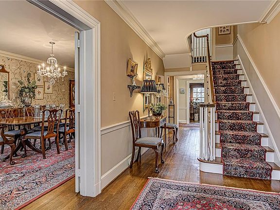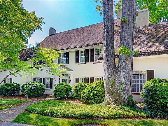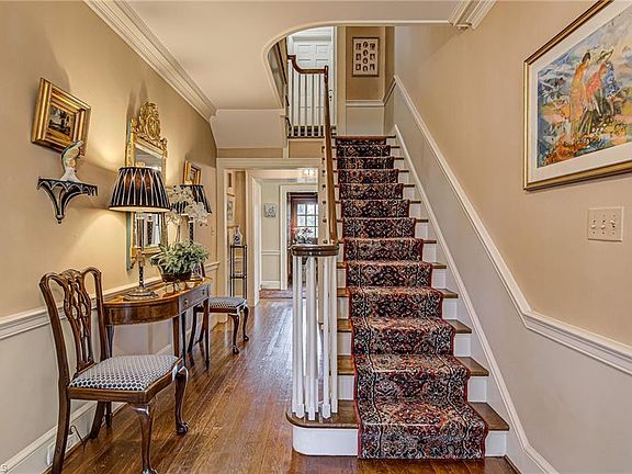 Exquisite c.1915 Colonial Revival estate uniquely combines elegance with the warmth of an inviting English cottage that holds pieces of Winston Salem history that will be yours. Beautifully located on an entire acre in Country Club Estates, you will find complete privacy surrounded by mature landscaping. Exterior is made of historic stucco with rolled roof edges designed to look like an English thatched roof. An elegant expansive foyer leads through a wood paneled bar opening to a large outside tile patio perfect for entertaining or morning coffee. One of the largest formal dining rooms in Buena Vista, handsome library connects to a private covered porch. ML has hardwoods throughout. Spiral staircase off the kitchen takes you to a private bedroom suite with built-in furniture. 4 additional bedrooms upstairs, 4 full baths and a home office. His/Her walk-in closets in Primary. 6 fireplaces in the main house. Attached garage studio with full bath. Separate carriage house.