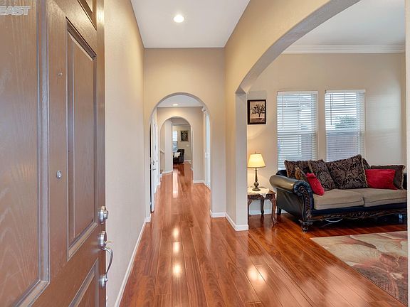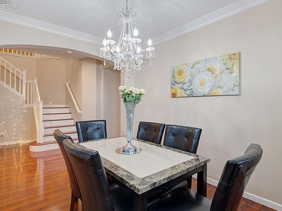 New Price! Beautiful north-facing corner-lot home in the highly desirable Eden Shores - Bright, spacious, and cozy! The property model boasts 5 bedrooms, 3 baths, and 2,687 sq ft of living space. The perfect floor plan features an open layout with an abundance of natural lights and towering ceilings. Conveniently offering a full bed/bath on the first level and a private den (optional 6th bedroom). A grand entry leads to separate living and dining rooms. Secluded patio areas adjoin living spaces for indoor/outdoor flow. A huge kitchen with a large island and breakfast nook offers modern finishes incl. Quartz counters, subway tile backsplash, and cabinetry. Spacious master suite with dual vanities and walk-in closets, standing shower, and large soaking tub overlooking stunning water bay via the window. Three other spacious rooms upstairs. Landscaped yards, and charming courtyard patios - perfect for outdoor living with a beautiful unblocked sunset view. An exclusive neighborhood offering parks, a pool and a clubhouse. Built-in solar to enjoy energy efficiency – options to own/lease. Best location, just minutes from I-880/92, COSTCO, restaurants, bay trail, and a bridge away from major employers in Penisula/Bay Area. Don't wait - Make this home yours today!