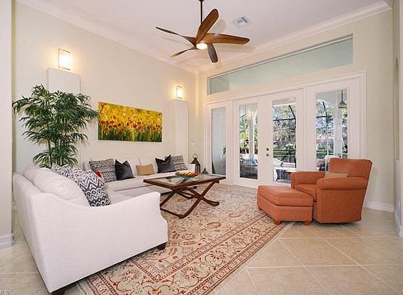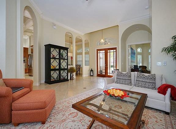 Upon entering this 3000+ Sq. Ft custom built home you immediately feel the open space for entertaining from the beautiful French door entry, 12 Ft ceilings, crown molding, and oversized screened lanai with pool, spa and spillover waterfall, all overlooking the 6th hole of Spanish Wells Golf Course. Home features 3 bedrooms, 3 baths plus office and Bonus small den with closet off of the guest bedroom. Living room, formal dining with built-ins, and family room. Chef's kitchen with custom cabinets, granite counter tops, glass back splash, new stainless steel appliances , including Bosch convection cooktop and a new wine bar with a 54 bottle wine cooler. Over $50,000 of improvements since 2013, too numerous to mention but include, new washer and dryer, gorgeous up-lighting at night, impact glass windows in the front of the house and electric hurricane screens for the lanai. Optional Membership at Spanish Wells CC includes 27 holes of golf, tennis, fitness and social activities. This 24 hour gated community is just 3 miles to Bonita Beach, 5 miles to Vanderbilt Beach with easy access to amenities, shopping and I-75 and just 20 minutes from the SW Florida Regional Airport.