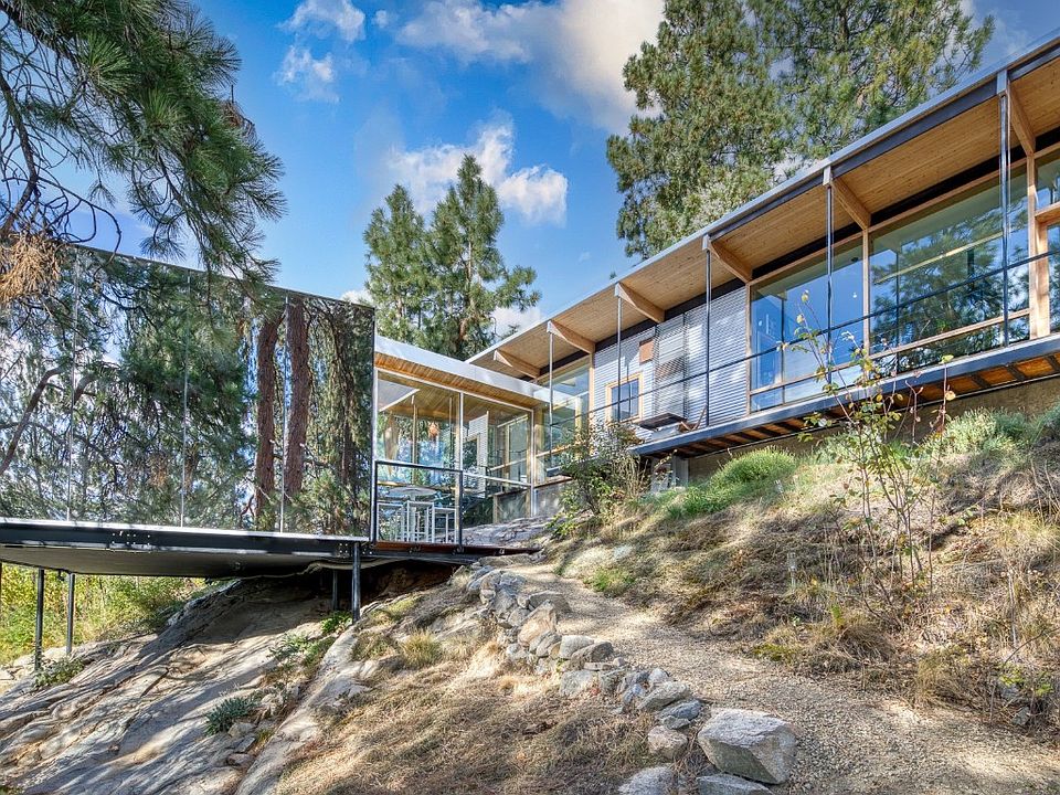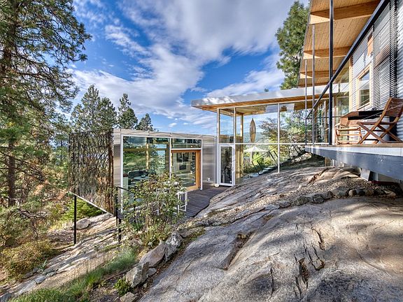 All but hidden from view is 2843 Arawana Place, a work of art designed by renowned Architect Florian Maurer. Designed as his personal residence, this home epitomizes his desire for the calm and serene as he believed the world was loud enough without him adding to it. Winning the Governor General's medal in 2006 for his design, Maurer connects the detached inside spaces by way of exterior flow for effortless functionality, with a focus on the magical courtyard space. In this home you find, rather than an abundance of square footage, a spaciousness bound with total privacy, achieving his goal of controlling the view so as not to have one's enjoyment and privacy governed by neighbours. Entering the gates, you pass by the upper level serving as a home office or guest suite, with an adjacent garage and storage area. From there, venture into a secret garden with entertaining spaces, corners for quiet retreat, and the beauty of dappled sun through the leaves of the trees. The second detached space serves as the primary bedroom, while the main space consists of the kitchen, large pantry, living room, and guest bedroom. A large wraparound deck affords gorgeous views through the trees to the lake and mountains where the sounds of nature settle over you. Completing the home is the gallery space, added by the current owners and set upon slim steel posts. Clad in stainless steel reflecting the sky and forest, this structure disappears as it floats above the bedrock, gently fitting into the surrounding greenspace. Book your private viewing of this one-of-a-kind home today! All msmts approx.
