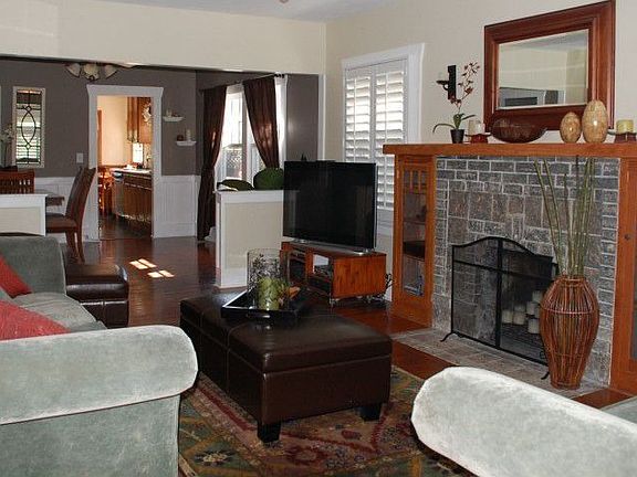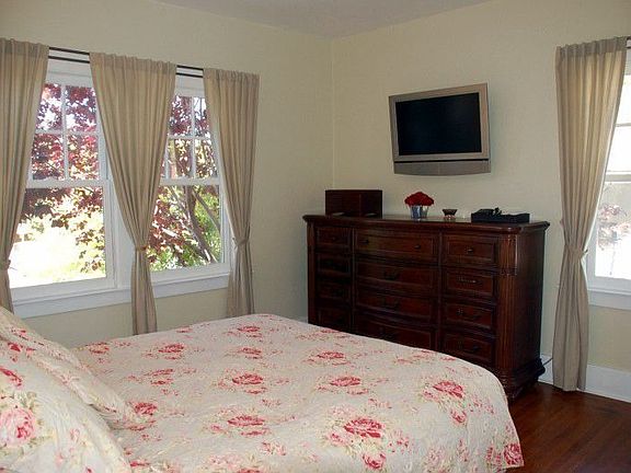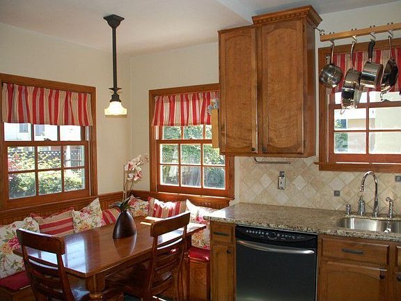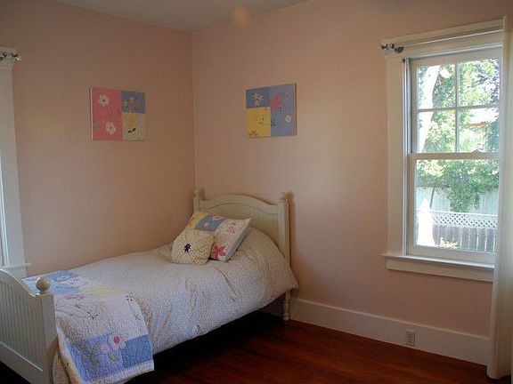 This 2+ Bed 1 Bath Craftsman Style Bungalow has been tastefully upgraded with fine attention given to period detail. This beautiful home is located in the East End of town on a quiet cul-de-sac street lined with other classic California Bungalows. An inviting covered porch and entry leads you into the living room which features a beautiful wood burning fireplace with classic built-ins and detailed glass doors on either side, as well as an original picture window with box detailing at the top. From the living room you walk into the formal dining room with custom raised panel wainscoting and then into the classic Craftsman style kitchen. The kitchen has been remodeled with Brazilian Green Slate Tile floors, granite countertops, stainless steel convection Viking Range and an LG side-by-side refrigerator. There is a built-in breakfast nook with a wall mounted LCD television (included). A slate tiled porch opens from the kitchen and leads out to the landscaped backyard that includes a lawn as well as a patio for entertaining. The classically updated bathroom features Carrera marble tile flooring, wainscoting and a claw foot bathtub. The bonus room has custom raised panel wainscoting, a cedar floor closet and a door leading to the backyard. This home has refinished oak hardwood floors and has been painted with classic warm and inviting colors throughout.