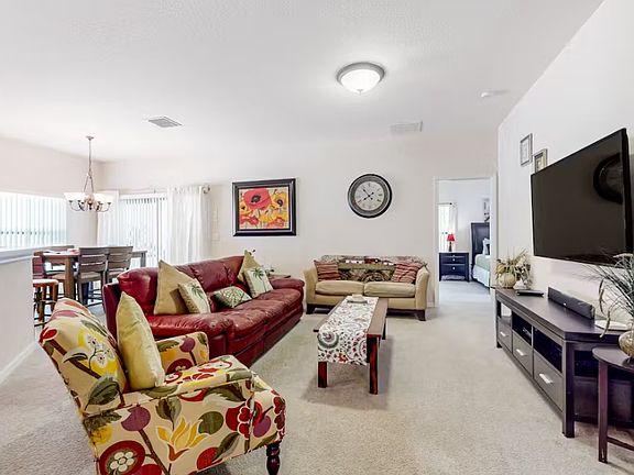Fully furnished Tuscan-style home in quiet neighborhood in close proximity to many dining options as well as a dine-in movie theater, outdoor shopping plaza which hosts vendors and live music regularly, Walt Disney World, Universal Studios, and much more. Rent for this home includes utilities. This 3 bedroom, 2 bath home includes a bonus entertainment (game) room with big screen tv and pool table. The sizeable lanai with a table for six overlooks a comfortable pool with wooded area and privacy screening on all sides. Owner and maintenance contacts are just minutes away if support is needed. Requires non-refundable application fee of $50. Flexible rental duration (short- and long-term) available from one (1) month to twenty-four (24) months with options to renew. PLEASE NOTE: The listed monthly rental rate does not include taxes charged by the State of Florida and Osceola County. Transient, aka Short-Term, Rentals are subject to 7.5% Sales Tax, plus 6% Osceola Occupancy Tax, in addition to the rental amount listed on this site. If rented for more than six (6) months, the aforementioned taxes will not apply starting in month seven (7), per Florida law. No smoking allowed within the home. Smoking is permitted on the lanai, around the pool area, and otherwise outside on the property. Rental amount includes: () electricity () water () wireless internet and basic (cable) television over fiber optic network () yard maintenance () pool maintenance