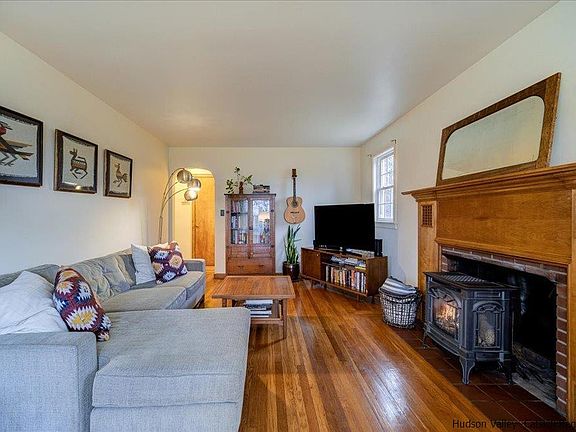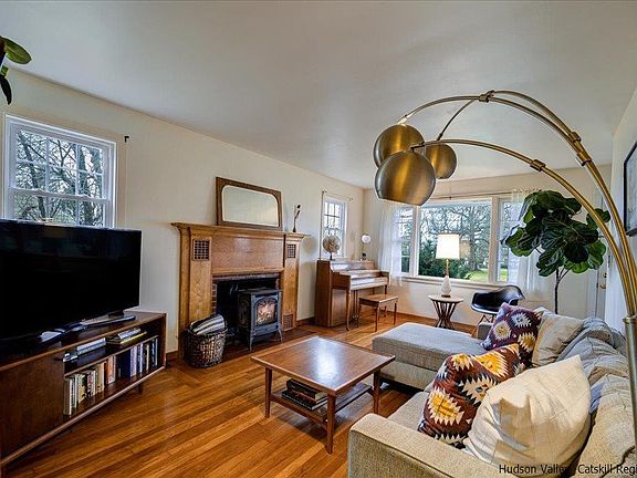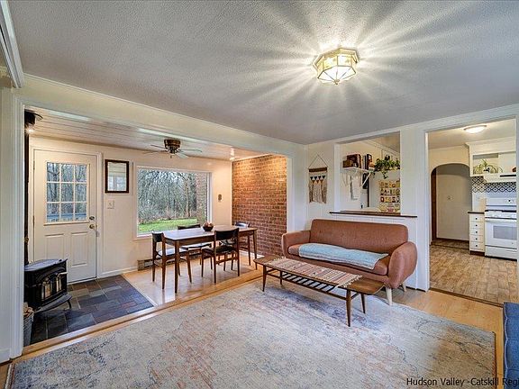OPEN HOUSE CANCELED!!Well built brick cape with mid century modern vibe minutes from the center of Stone Ridge. Bright & airy w/ the hub of the home comprised of open kitchen with breakfast bar, family room with built-in storage and shelves and sunken dining room. Cozy woodstove in the DR, exposed brick wall and views of the deep, private backyard. Additonal gathering place includes a charming LR with gleaming wooden surround and mantle and propane insert. The rest of the first floor includes a primary BR with full bath, another bedroom with built-ins galore and another full bath. Second floor boasts identical bedrooms w/ built-in dressers, tons of storage & a shared half bath. Screened in porch and deck looking over private, fully fenced backyard. Large garage with ample storage and many more great details.