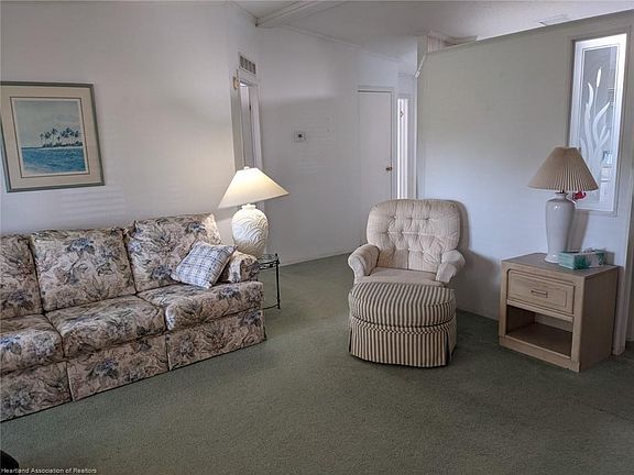 Beautiful Highlands Ridge has many amenities: lakefront with boardwalk, boat docks, 2 pools, pickleball, tennis courts, community center with exercise room, ballroom, library/computer room, etc. This home is in the rented land section and comes fully furnished with a golf cart. Split floor plan with 2 bedrooms & 2 bathrooms, open living area concept, inside laundry area and covered rear screen porch with sliding vinyl windows. Roof replaced 2017 and A/C 2016. The lot rent of $450 includes grass cutting and the use of the aforementioned amenities. Adjacent there are 2 great 18 hole golf courses, for which fees apply. A small annual HOA fee of $15 is required. Residency approval is required from the landowner prior to submitting a contract, for seller convenience, the home is sold as is with inspections welcome. The community is gated at night and large dogs are allowed.