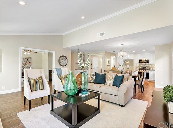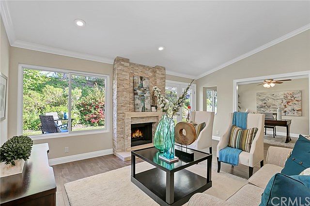 This desirable Rosa model has been completely remodeled with high-end finishes and designer details to provide comfort and beauty for years to come. Views from front to back, a custom designer niche, tiled accent wall, new flooring, and extensive crown molding greet you as you enter this light and airy 2-bedroom home plus den. Open living spaces flow between a new kitchen, dining area, living room, and den. The new kitchen features quartz countertops, designer backsplash, stainless steel appliances, under-cabinet lighting, self-closing drawers, spice rack, and abundant cabinet space. A natural floor-to-ceiling stone fireplace creates a warm ambiance in the adjoining living area complimented by two sets of new elegant patio French doors. The den includes a built-in custom cabinet with quartz countertop. The master bedroom features vaulted ceiling, walk-in closet, double sinks, and an enlarged designer shower with frameless door. The second bathroom has floor-to-ceiling glamorous glass tiles with the addition of a new window to bring in more natural light. More storage space has been added with a custom built-in hutch in the hallway. Set on a corner lot adjacent to a large greenbelt, an extended patio offers privacy overlooking a gorgeous slope with beautiful flowers, plants and trees. To top it off, the home features new A/C, water heater, and garage door. This magical home is truly one of a kind and will not last!