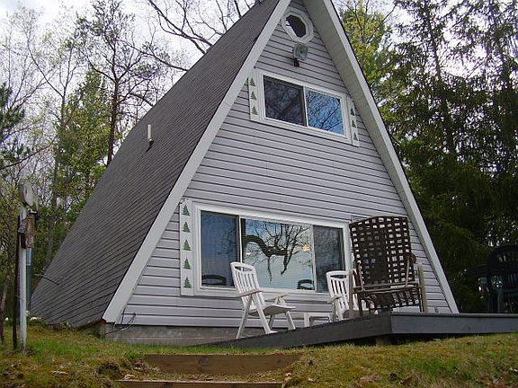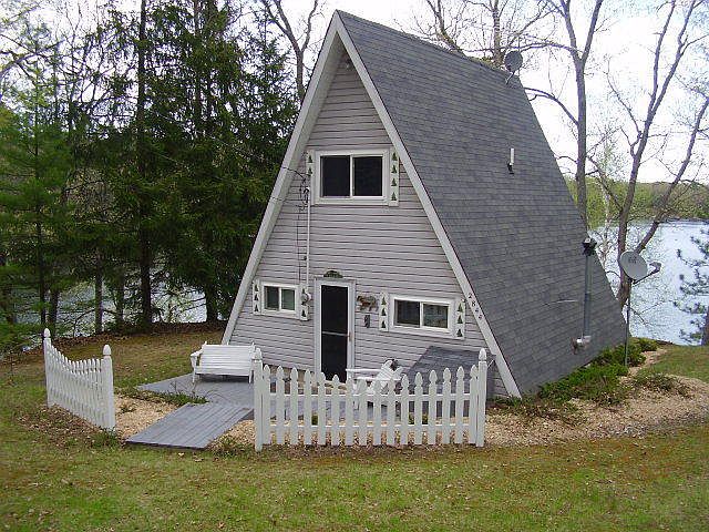 CURRAN AREA - This story book lake front charmer is ready to move into. 2 bedroom 2 bath A-Frame with 98 feet of frontage on NO WAKE Crooked Lake. One bedroom features a loft for those extra guests. Spectacular view from lake side deck. Here you can really enjoy that early morning coffee as the Sun rises. Includes a 1 car garage for storage. Owner says aluminum dock will stay. Located in Private Crooked Lake Club. Will make an excellent vacation retreat for under 100K.