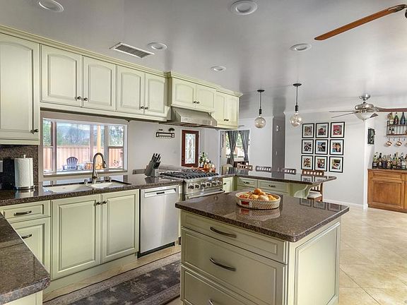 The family compound you have been looking for! This beautiful property includes a 2-bed, 2-bath main home and a 1-bed, 1-bath guest house with a private entrance and patio. The main house boasts a gourmet kitchen featuring Viking and Bosch stainless steel appliances, granite countertops, and a work island. The primary bedroom has an expanded en-suite bathroom and an attached patio with a tranquil waterfall. Outdoor living is a dream with front and back patios, solar-heated pool, and energy-efficient owned solar panels. The detached 2-car garage includes an office with a bathroom and outdoor shower. The RV garage offers ample space (50x20) with concrete flooring, RV 30-amp outlets, and a septic dump. The property spans flat, usable land with a productive well, automatic entry gate, and 3 separate entrances. It’s perfect for equestrian use with cleared areas for horses and drivable access around the entire property. There’s also a fully fenced yard within a 2-acre, chain-linked perimeter. Other key features include solar-heated water, an in-house automatic 14KW generator, and outdoor lighting surrounding all patios, plus a cozy outdoor fireplace. The guest house is equipped with split air conditioning and its own private space, making it ideal for visitors or extended family. This versatile property offers the perfect blend of luxury, functionality, and sustainability.
