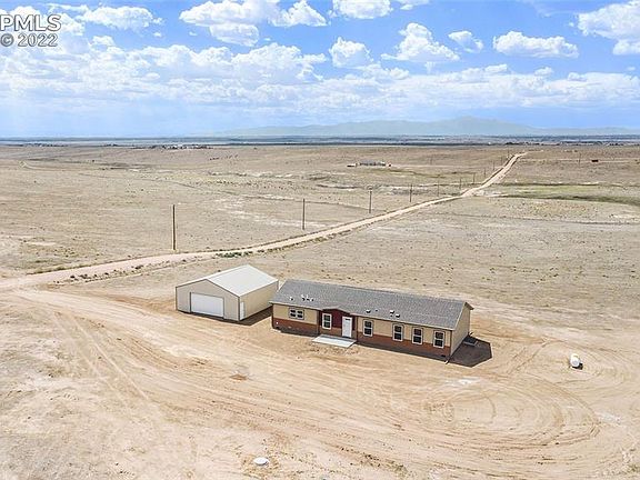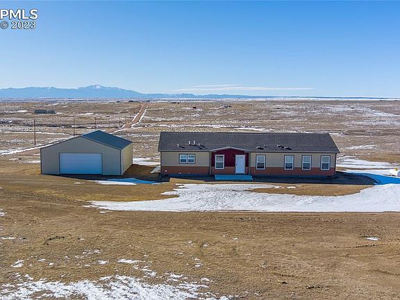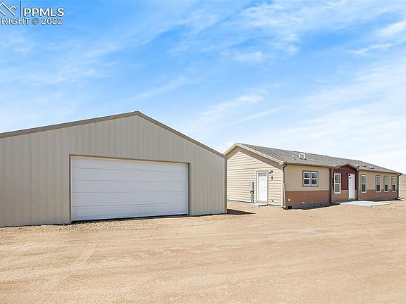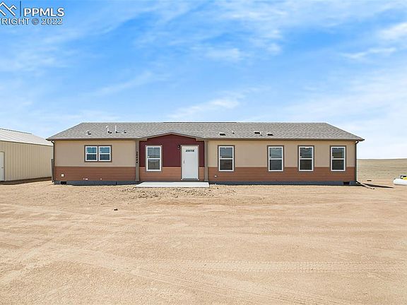 This brand-new 1716 sqft ranch style home was completed in 2022. Stepping into the foyer, you are welcomed by pleasing tones and fresh appeal of this never lived in home. The foyer offers a walk-in closet featuring cabinets and a mounted bench for easy storage as soon as you walk in. A stylish barn door closes this closet from the entrance. Past the foyer, the home opens into the large living room, which boasts a beautiful built-in fireplace. This space also offers upgraded plush carpets and a ceiling fan to help keep the home at a comfortable temperature. The living room opens to the kitchen and dining area. The kitchen features raised panel hickory cabinets, tile backsplash, stainless steel appliances, including a gas/propane range, microwave and dishwasher, and a pantry. A perfectly placed island separates the kitchen and dining area to maximize the charm and functionality of the space, as well as offer breakfast bar seating. This space is finished with snap vinyl flooring, providing a stylish and durable flooring that will complement any décor. Through the kitchen you can access the laundry/utility room. Upgraded with more storage cabinets, a fantastic stainless steel utility sink and a walk-out, the laundry room is the perfect entrance on those muddy days. On the other end of the home, you will find a full bathroom, ideally set between the living areas and the two spacious secondary bedrooms. The hallway concludes at the primary suite. This large room features a walk-in closet, ¾ private bathroom and bench with storage. All 3 bedrooms are completed in the same upgraded plush carpets. This home rests on a permanent foundation within the beautiful 39.12-acre lot. This property also hosts a 30x30 outbuilding with an 8ft overhead door and man door, as well as a newly drilled well and installed septic system. This amazing property has stunning views of Pikes Peak, the front range, peaceful prairies and offers quick access to Calhan Rd. Virtually Staged photos.