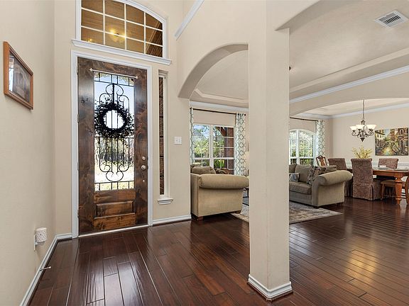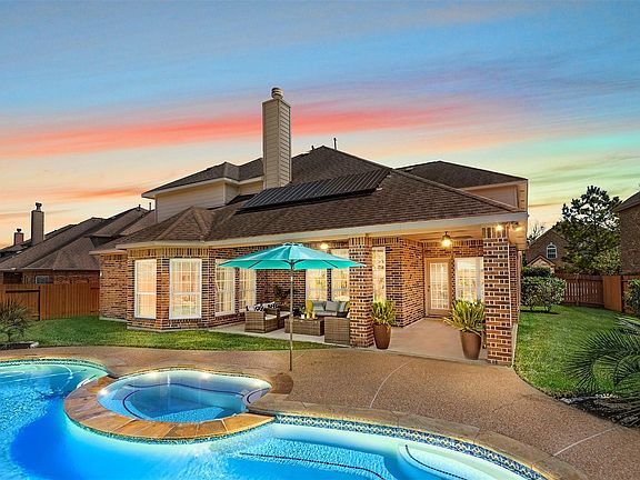 Stunning 5 bedroom home on an oversized lot with a salt water pool nestled inside the 24 hour guard gated neighborhood of Harmony Creek walking distance to neighborhood amenities & schools! Grand entrance with soaring ceilings & winding staircase, hardwood floors in all main living areas, both formals (or perfect extra flex rooms), study with French doors & built in. Gourmet island kitchen w/double ovens, butler's pantry + a sunny breakfast area open to the 2 story family room with floor to ceiling stone fireplace. Private owner's retreat with sitting area & spa-like ensuite features a soaking tub, separate shower, 2 sinks, vanity space & large closet with built ins. Game room, media room, 4 BR's & 2 full baths up. Huge yard w/gorgeous pool/spa, large L-shaped covered patio + plenty of extra yard space, whole home water softener. Harmony offers 2 pools, 2 splash pads, walking trails, tennis & basketball courts, gym, parks & club house. A+ schools. Updates, top 10, floor plan attached.