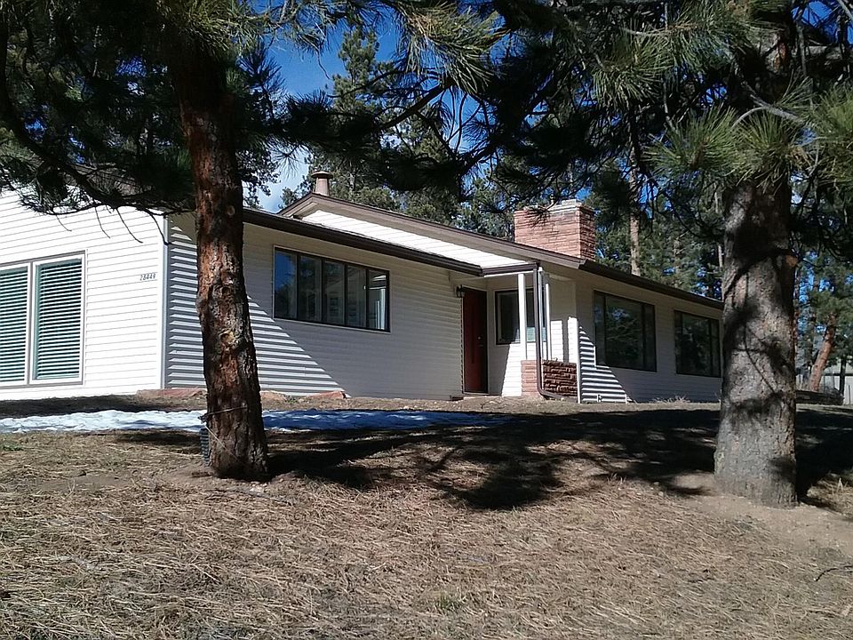 This home offers the best of Evergreen living — peaceful mountain ambiance combined with the ease of single-level comfort. The kitchen, dining, and living room flow together seamlessly, creating a warm, inviting space perfect for gatherings with family and friends. Hardwood floors lead down the hall to three spacious bedrooms, each with walk-in closets, while the layout includes a three-quarter bath in the hall and a full bath in the end bedroom for convenience.