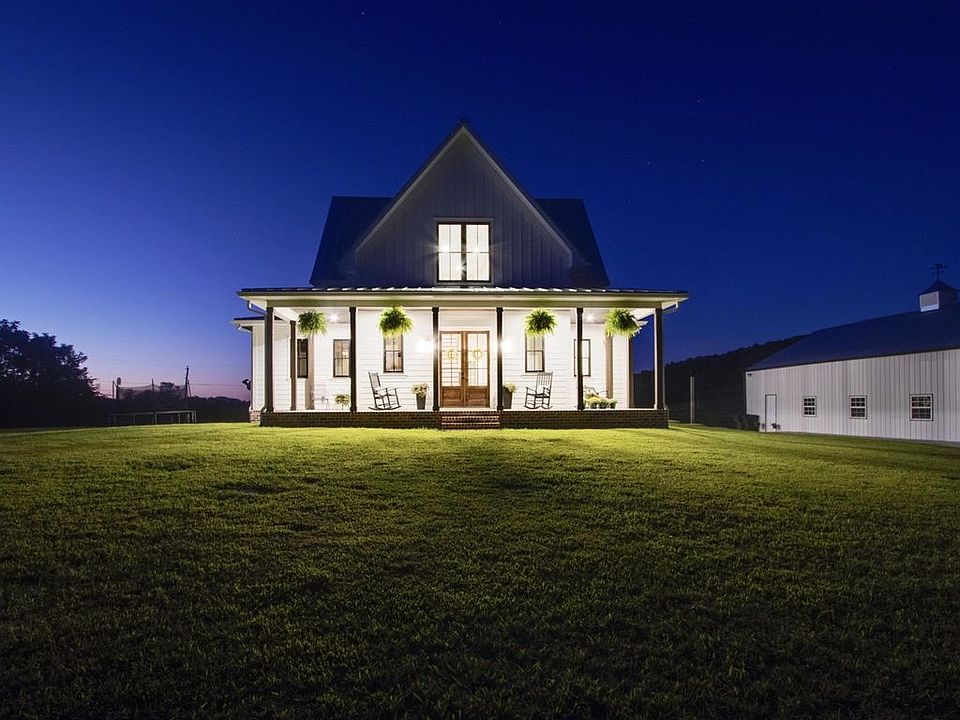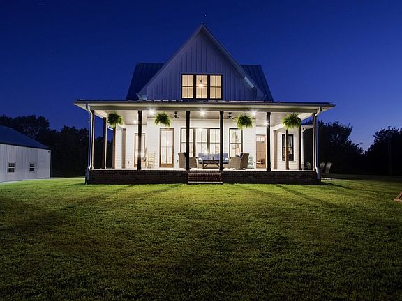 Southern Living Home on 73.75 acres (1800ft of road frontage) just off Hwy 70 located at 2845 Beech Log Rd in Wilson County, TN. This Four Gables farmhouse was just built in 2018 and offers beautiful year round unobstructed views of rolling hilltops. Luxurious touches throughout including granite and tile in all bathrooms. 12 foot tall entry doors. 4 bedrooms, 3 1/2 baths, living room with fireplace, formal dining room, large eat in kitchen. 60x50 two car detached garage w/ water and electric!