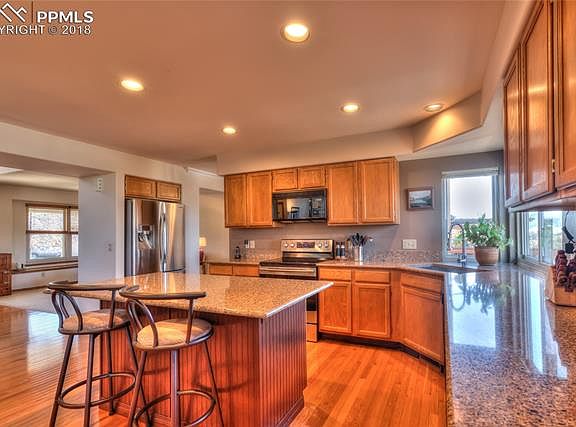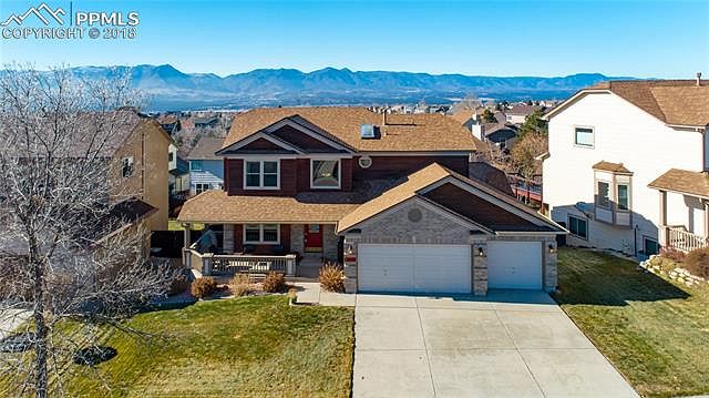 Unbelievably well kept & updated Summerfield 2 story with terrific Pikes Peak & Front Range View! 400 sf deck, finished walkout basement, upgraded vinyl windows, office on main level could be 5th bedroom if closet added. 3 car garage w/oversized 3rd bay, remodeled eat-in kitchen w/quartz counters, newer appliances, & island. Updated bathrooms, large front porch, wired for central sound system, A/C, lots of storage, 2 story family room on ML w/fireplace, sprinkler system, LL FR plumbed for bar. Did I forget anything? Quiet street, walking distance to D20 elementary, middle, & high schools, as well as restaurants, grocery store, pharmacy, & other shopping. NO CLOSING BEFORE 2-19-19