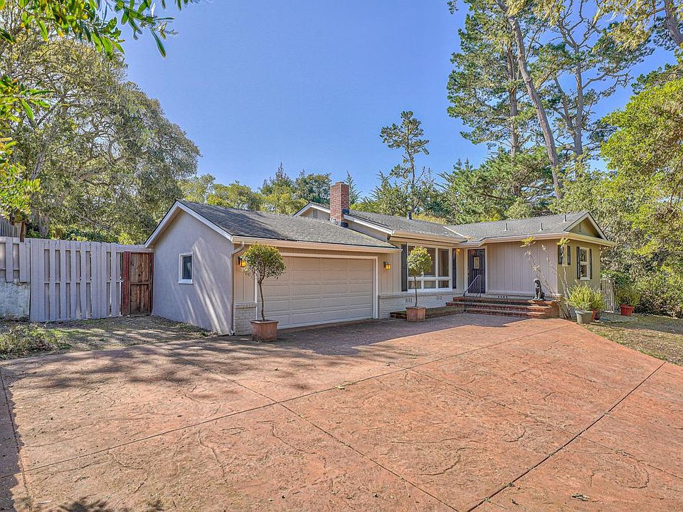 This gem of a home is located behind the gates of Pebble Beach and is just minutes to Spanish Bay! Enjoy all the beautiful areas of the Monterey Peninsula... Carmel, Pacific Grove, Big Sur, Pebble Beach, golf courses, restaurants, beaches and more! This 3 bedroom/2 bathroom home has recently been painted inside and out! The stamped concrete driveway leads to an attached 2 car garage and has a space for an oversized vehicle. The front yard has beautiful stone walls, garden area and mature trees with ocean views from the front on clear days. Enjoy all the natural light throughout from the large windows. The living room has wood floors and gas log fireplace and opens to the dining area. The kitchen has unique cabinets with built-in's & a garden window. The primary bedroom includes an over-size cedar closet with a private bathroom. French doors lead outside to a deck which overlooks the picturesque gardens filled with flowering plants, trees and paths with multiple levels to enjoy.