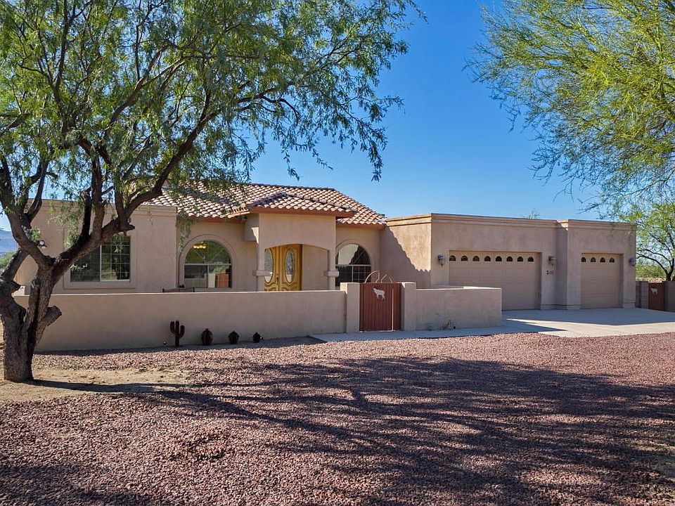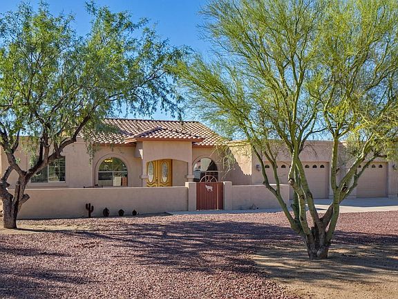 The courtyard area welcomes you to this custom built home on 1.11 acres of land with no HOA fees. Spectacular mountain views, built in 2007, 2,475sf with 3 bedrooms + office, 2 baths and a 3 car garage. Great room has wood burning fireplace & is open to the kitchen that has hickory cabinets, granite counters, built in microwave, stainless steel appliances, undermount sink and a large pantry. Master suite has a private sliding glass door to patio, a jetted tub, separate shower, porcelain tile floors & custom walk in closet. Huge backyard w/ 60 ft long cov'd patio, a 12 ft side gate and plenty of room for a POOL. Solid Red Oak floors throughout, surround sound, soaring ceilings, 2 HVAC units & 80 gal WH w/recirculating pump.