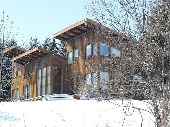 Beautiful views from this contemporary home with large southern facing windows for direct gain of sunlight to absorb heat as well as passive cooling to reduce summer cooling requirements with vent dampers. Kitchen island sink. Interior contains neutral elements and has an open floor plan while still maintaining some areas of privacy with living room space on each end of the house. Wood stove & natural woodwork give a clean & cozy feel. 2 full first floor bathrooms and 1st floor laundry. Mudroom and closet at attached garage entry. House hidden from road with short evergreen lined drive. Partially wooded/open yard. Garden area & shed w/ some fencing. Large southern facing deck is great for private enjoyment or entertaining. Close to Hamilton/Colgate University. 8 acres!