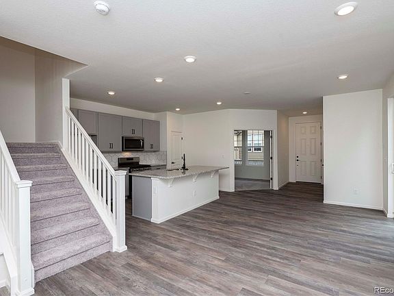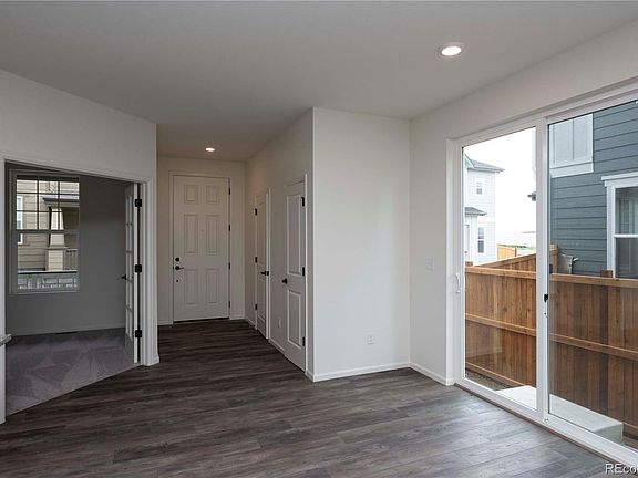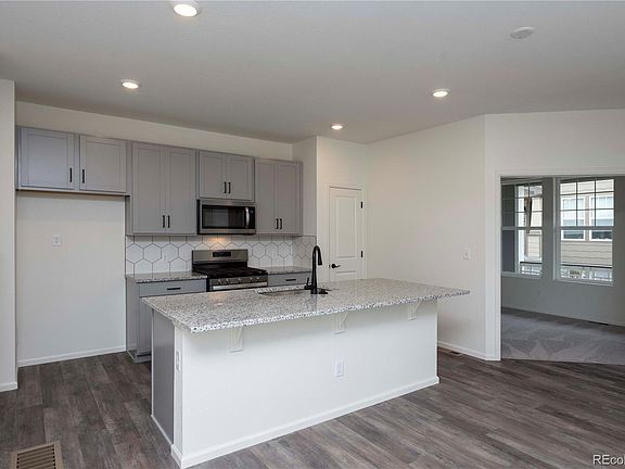 This beautifully upgraded home is complete! It has 3 bedrooms, 2.5 bath, office with French doors, loft, private side yard, unfinished basement and attached 2 car garage with full size driveways. It features an open friendly kitchen, and oversized great room that is perfect for family and friends gatherings! Main level vinyl plank flooring, granite kitchen counter tops, grey/white cabinets, and much more! The Metro district covers public common area maintenance, alley maintenance, and alley snow removal. The HOA covers front yard maintenance. The homeowner is responsible for leaderwalks and driveways, and all side yard maintenance. Master-planned community four miles south of DIA corridor. Low Maintenance paired homes with private side yards and full size driveways. Commuter friendly; near I-70 and E-470 Short drive to local shopping, dining, and entertainment, including Southlands Shopping Center and The Gaylord of the Rockies. The Listing Team represents builder/seller as a Transaction Broker.