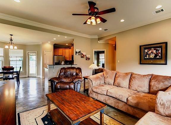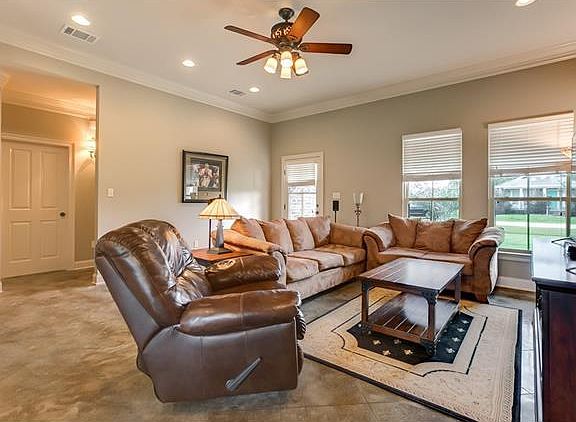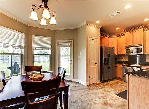 Great updated home by Solemnity Builders! Shows like new! Updated light fixtures throughout, tall ceiling in den w/double crown molding, stainless appliances, granite counters, backsplash & breakfast bar, smooth top cooktop, stainless refrigerator remains! Tray ceiling w/molding in master bedroom. Master bath features a whirlpool tub, separate shower, two closets & chandelier. Scored, stained concrete floors throughout. Covered patio w/scored concrete. Great investment property! S/D pool & playground.