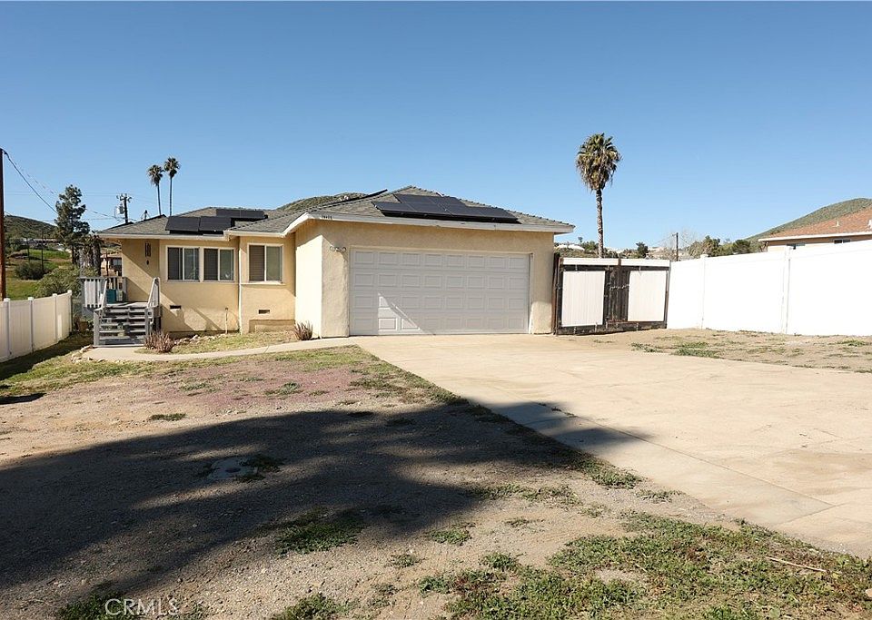 This home is located in the desirable area of Menifee, Quail Valley Mountain View subdivision and an opportunity for the first time home buyer and has great potential to create the perfect space to meet the new owners personal desires and needs. The home offers 970 sq. ft. with two bedrooms, one room has been converted off the living room area, that can be used as a third bedroom or office space, and there is one full bath, as well as original wood floors throughout. The seller has recently installed a new HVAC Unit in September of 2022, and an electric water heater 5-years old, new cabinets in the kitchen, with lovely center island, and new paint though-out, exterior facia and window sills are also being painted. Large back yard with elevated garden area to create your own vegetable or flower garden, and plenty of space for the kids to play. The back deck was constructed with 14 inch manufactured high beams, that were installed with construction screws, as well as commercial grade materials, and the perfect area and space to install a jacuzzi to enjoy the evenings or relax after a long day. The home sits on a 12,197 sq. ft. lot, and has great front footage and enough parking for a boat, RV and 5 vehicles.