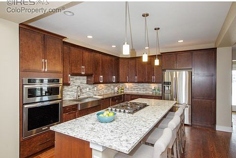 Better than new semi-custom Indian Peaks home w/all the upgrades imaginable! Wood floors, quartz counters, high end cabinetry & appliances, glass backsplash, farm sink:No expense spared! Premier 1/3 acre lot backing to open space w/views.Bright, open floorplan w/main & upper level offices; finished bsmt w/guest suite, rec room & game room; great front porch; deck off master; large mudroom; huge garage; two outdoor decks w/fireplace. Walk/bike to Downtown Louisville & neighborhood shops & dining!