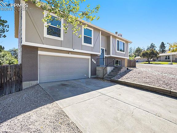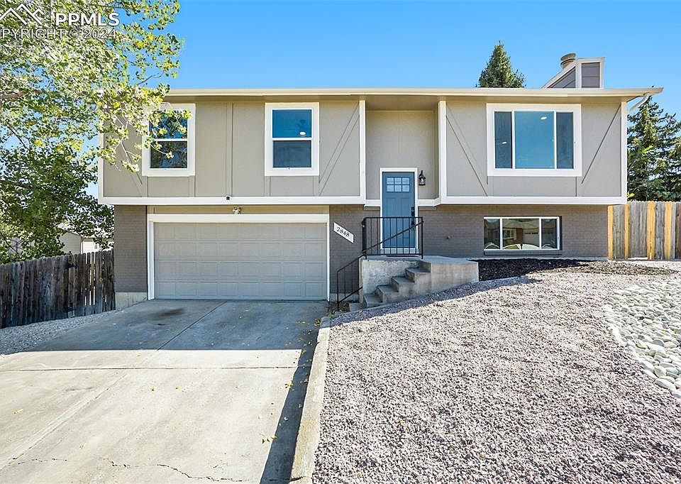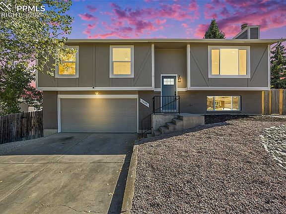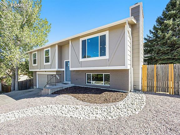 Gorgeous remodel! Welcome to your new home. This charming bi-level home offers the perfect balance of modern comfort and prime location, with easy access to all the town's amenities. Amazing view of Pikes Peak! Recently updated, the home features a thoughtfully designed layout, highlighted by a spacious great room that effortlessly blends the living, dining, and kitchen areas into a cohesive and inviting space. The interiors are bathed in natural light, complemented by stylish laminate flooring and elegant lighting throughout. The kitchen is a true focal point, boasting new cabinets with solid surface countertops, sleek stainless steel appliances, and direct access to a large deck—ideal for outdoor dining and entertaining. On the main level, you'll find three well-appointed bedrooms and a full bath off the hallway. The lower level reveals a luxurious family retreat, complete with a fireplace for those chilly winter nights and an additional full bathroom for added convenience. The great room adds a cozy touch, creating a welcoming ambiance for family and friends. Significant upgrades include new doors, trim, texture, flooring, lighting, custom-tiled bathrooms, a kitchen remodel with new stainless steel appliances, and updated lighting. A nice-sized two-car garage, with additional parking off to the side of the driveway, making this a perfect spot for a toy or two. The exterior is equally impressive, with a xeriscaped front yard. Close to schools, shopping, resturanrts, hospitals. Set your showing today