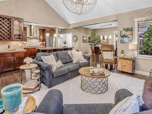 Gorgeous ranch on a large corner lot near the community swimming pool featuring an ideal open floorplan with a main floor master bedroom and a finished basement with rec room, and private bathrooms for each bedroom. Beautiful, low-maintenance xeriscape front yard with a private front porch, as well as, an entertainment-ready SW-facing backyard with lush grass, flagstone patio, outdoor lighting, and custom landscaping with many trees, shrubs, and flowers. High-end finishes include slab granite with chiseled edge, cherry shaker cabinets, restoration hardware chandeliers, exquisite light fixtures, 5" hickory engineered hardwood, dual zone wine fridge, gourmet kitchen, hand-trowelled walls, and fireplace. The spa-like master bath has a chandelier, expanded shower-floor to-ceiling tile, and a separate jet tub. Oversized, insulated finished garage with a workbench and custom storage system for all your projects and toys. The basement also includes a large organized storage and craft room. The premium corner lot is highly desired with plenty of light, a spacious yard with privacy trees, and plenty of parking. Main-floor office could be converted to an additional bedroom as well as space for an additional bedroom(s) in the basement. There are too many custom details to mention so come see it in person! Seller is a licensed real estate agent in the State of Colorado.