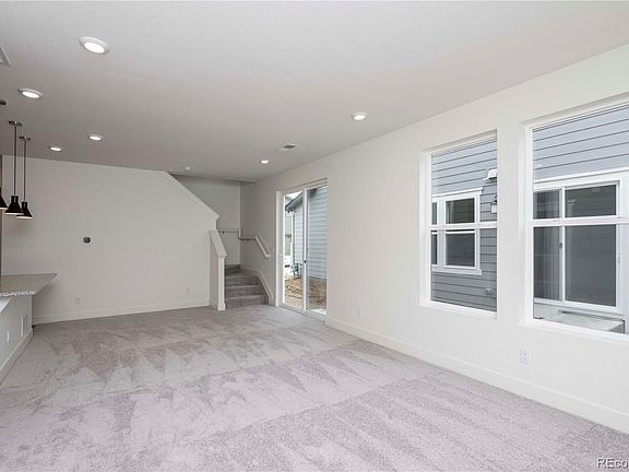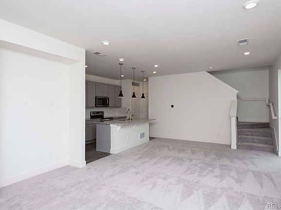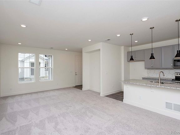 Master-planned community four miles south of DIA corridor. Low Maintenance paired homes with private side yards and full size driveways. Commuter friendly; near I-70 and E-470. Short drive to local shopping, dining, and entertainment, including Southlands Shopping Center and The Gaylord of the Rockies. This beautifully upgraded new construction home is ready for move-in! It has 3 bedrooms, 2.5 bath, flexible loft space, private side yard, and attached 2 car garage with full size driveways. It features an open friendly kitchen, and oversized great room that is perfect for family and friends gatherings! Main level vinyl plank flooring, granite and quartz counter tops, grey and navy cabinets, standing glass shower, extended garage, and much more! The Listing Team represents builder/seller as a Transaction Broker.