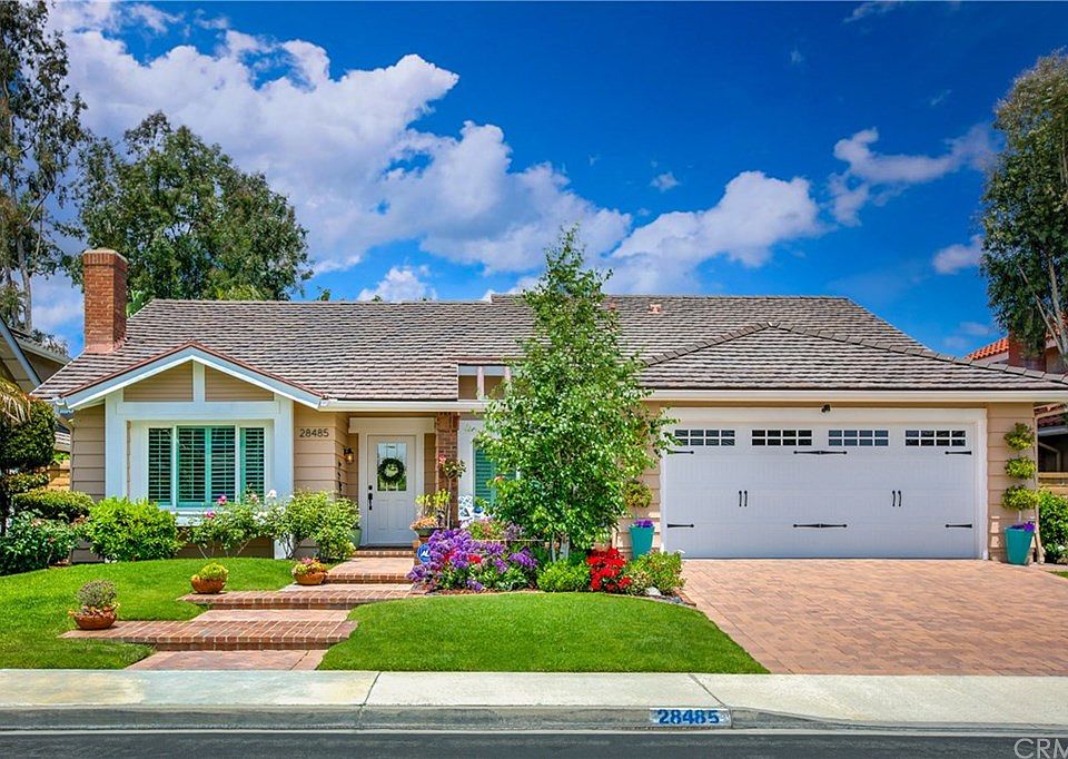 Amazing Single Level Upgraded Pool Home! This rare model is located in one of Laguna Niguel's most coveted neighborhoods and has 3 bedrooms, 2 bathrooms, high ceilings, beautiful upgraded flooring, natural light that flows from the living area to an absolutely stunning rear yard! There is an approximately 100 square foot sun room off the kitchen that can be used as a breakfast nook overlooking your beautifully landscaped pool area. The tranquil surroundings of trees, flowers, and sounds of water coming from the custom pool waterfalls are breathtaking. The kitchen has been upgraded with granite counter-tops, custom tile back splash, custom drawer handles, and Stainless Steel Appliances Included! The bedrooms are spacious, with a master bedroom with sliding glass door opening to the spa area. The master bath has dual vanities with an additional closet with built-in organizers! Formal living and Dining areas with neutral soft paint are perfect for entertaining! Brick fireplace, Central A/C, Water softener, Double Pane Windows, Skylights, Washer & Dyer inside, large 2 car garage with built-in cabinets, New custom Garage Door, and New Front Door! The curb appeal is stunning with newly painted front exterior, beautiful landscaping, custom brick steps and paved driveway! THIS HOME IS A MUST SEE!!!