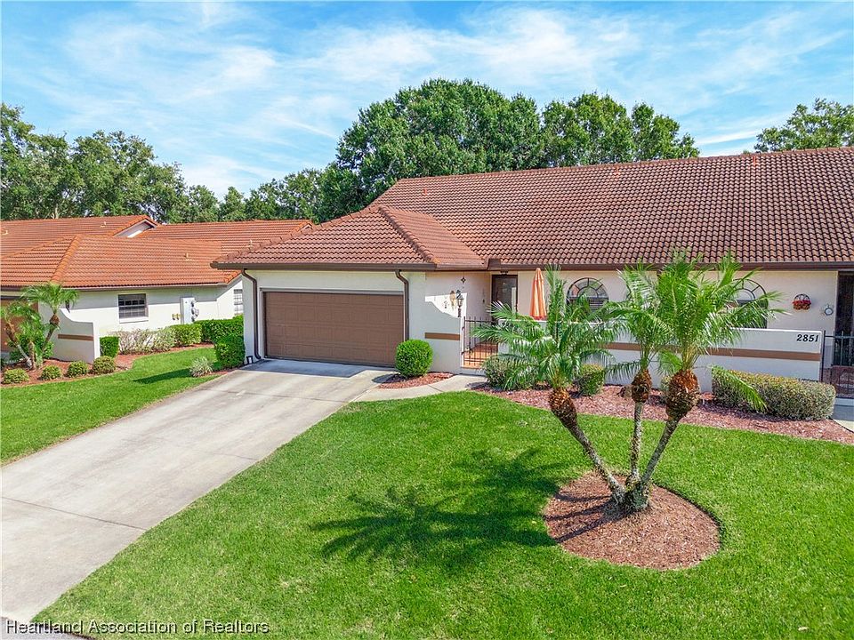 PRISTINE Casa Del Lago Villa! This 2 bedroom, 2 bath villa offers an open split floor plan, cathedral ceiling, tile & vinyl plank flooring throughout, living & family room, dining area + breakfast nook, interior laundry room, 2-car garage + screened lanai & tiled courtyard. The granite kitchen w/large breakfast counter is open to the living & dining area. Screened lanai accessed from the family room. The master suite includes walk-in closet, double sink vanity & updated 5x6 tiled shower (handicap accessible) w/grab bar & bench seat. Spacious guest bedroom + full bath. Laundry room w/washer, dryer, laundry tub + refrigerator. 2018 AC. Being offered partially furnished, if desired. Sale includes golf cart! This popular community is not only a cart ride away from River Green golf course; it includes deeded access to Lake Damon, w/dock & gazebo & nearby boat ramp. Community amenities include community center, heated pool, tennis, pickleball & shuffleboard courts, motor home & boat storage. HOA is $460/mo. for a carefree lifestyle! For further info on Rules/Regulations & the Assn., visit website: https://casadellagoavonpark.com/