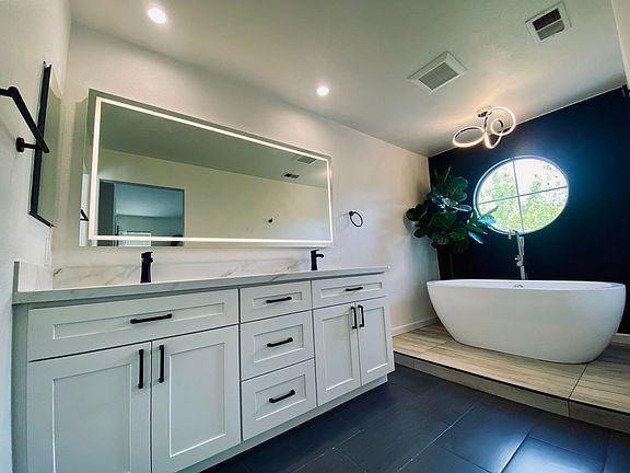 This 3BD/2.5BA stunner is not to be missed. Modern kitchen with quartz countertops, beautiful cabinetry, stainless steel appliances and even a pot filler above the stove makes cooking a breeze. A half bath and full laundry room with Washer/Dryer included are located downstairs. The large family room has vaulted ceilings and cozy fireplace. The dining room with bar leads out to a low-maintenance yard with lovely patio and awning. Upstairs you will find 3 nicely appointed bedrooms, hall bath with tub/shower combo. The gorgeous primary suite has a grand, stand alone tub, double sink vanity with one-touch dimmable mirror and separate, extra large shower making this the perfect spa environment to relax after a long day. Other Amenities Include: 2-car garage, private community pool just up the street and the Mountain View park is within in walking distance! Take a virtual tour! Schedule a Showing today!