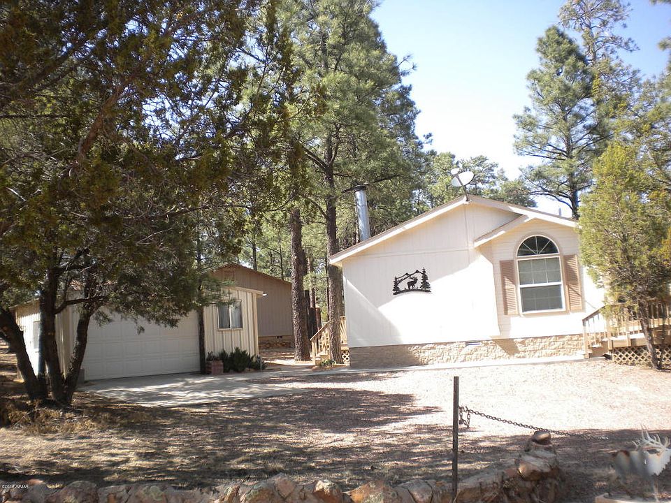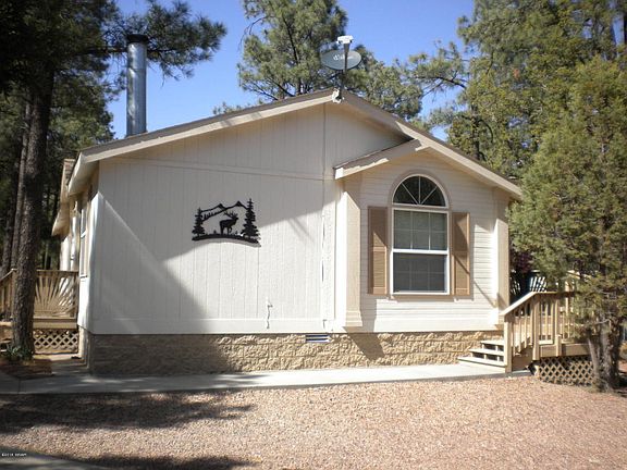 Wow , don't miss out , this beautifully maintain home surruonded by towering ponderosa pines, Covered porch , patio and house fully furnished . Wood burning fireplace in living room for those chilly nights , 4 sky lights for lots of natural light , Home has full cement pad under it with cinder block stem wall for easy maintance. Come take a look . Navajo County Varies on sq. footage so Buyer to verify.