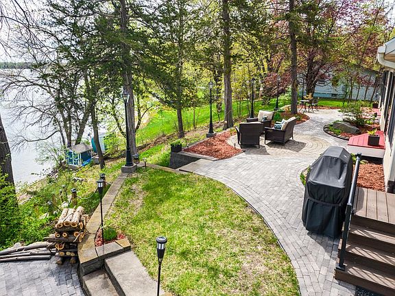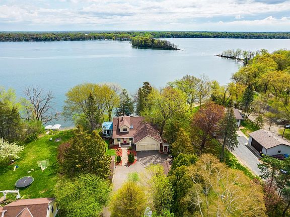 Expanded and remodeled home keeps the charm of the 1920’s with today’s comfort. Large amount of main floor living including 18 x 14 sunroom with fireplace, large living room with vintage fireplace, big primary bedroom with huge closet/private bath and family room with lots of windows facing the lake. Also outside there is a 60 x 20 paved patio overlooking the lake with a fire pit to enjoy the lake view. Upstairs includes two bedrooms and a bath plus loft area to watch TV. Lower level refinished laundry area includes washer and dryer. The attached 24 x 24 garage has plenty of cupboard space with sink. The detached 24 x 28 garage/shop is heated and comes with a work bench and tool chest. Other features include 2 year old roof, water filtration system, Wi Fi TV stereo, Midco wired Samsung home cinema smart TV. Good internet speed. A long driveway with lights off the dead end road separates the home from traffic noise. The lake access in newer with concrete steps/rope hand rail.