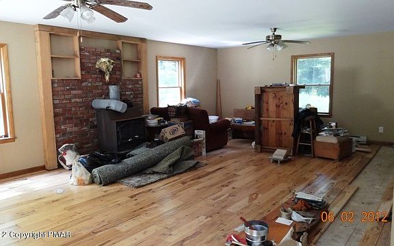 4BR, 2 BA contemporary styled colonial single family home on private 2.20 acre lot, partially wooded. Great potential, with a little more work, this home could be a real gem! 4BR (includes MBR w/ master bath & balcony), 2 full baths (one needs finishing). Catherdral ceiling in kitchen. LR & large family room with wood stove (flooring needs to be finished off). Pella windows throughout. Large covered front porch and detached one car garage.