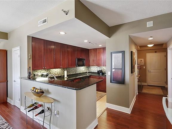 It's all about the Views in this Corner Unit! A true work of art in decorator neutrals w/cherry wood floors throughout. Open plan features floor-to-ceiling windows w/a stunning view of downtown. Dining area opens to airy balcony w/green views of Civil Rights Mus & Aquarium. Cherry cabinets & granite counters in Kitchen. Bedrooms offer walk-in closets & garden tub in master. HOA incl cable TV, hi-speed internet, fitness center, concierge, guest suite, plaza w/firepit, dog-walk & grills, & rooftop pool. Walk to Benz Stadium, Arena, & more!