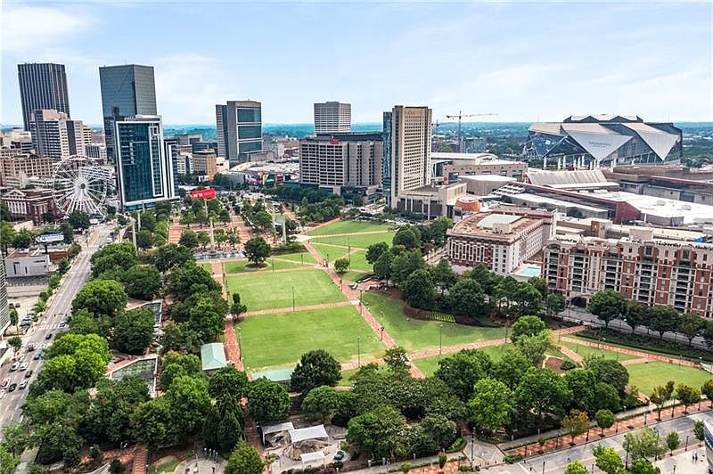 VERY MOTIVATED SELLER ~ MOVE IN READY ~ FRESHLY PAINTED, NEW FLOORING. This beautifully appointed two-bedroom, two-bathroom corner unit offers a luxurious and convenient living experience in the heart of the city. The recent upgrades, including new paint, flooring, and appliances, make this condo move-in ready. With captivating views of Centennial Olympic Park, Mercedes Benz, State Farm Arena, and Bobby Dodd Stadium, you'll have a front-row seat to the city's vibrant energy. The prime location places you in close proximity to Americas Mart, surrounded by bustling hotels, entertainment venues, and the lively Centennial Park. Its equidistance between GaTech and GaState makes it an ideal location for a livable community. The 24-hour concierge service ensures a secure and opulent living experience. The rooftop features a sparkling pool, and the plaza level offers a clubroom, conference facilities, and a fully equipped gym. The outdoor spaces include inviting seating areas, grill stations, and even a dedicated dog walking area. For guests, there's a suite available. The high-rise oasis above Centennial Olympic Park puts you steps away from a thriving hub of business, theater, and culinary delights. You can explore the city with ease, whether it's the Upper Westside, West Midtown, Piedmont Park, or the Atlanta Beltline-all within walking, biking, or a short car ride away. The property's amenities, including 24-hour concierge, secure parking, assigned parking, and balcony storage, contribute to a welcoming community with a robust HOA. Additionally, being Conventional/FHA/VA approved ensures a hassle-free experience for potential buyers. Don't miss this extraordinary opportunity to embrace the finest aspects of the Atlanta lifestyle, from renowned restaurants like Ted's, Margaritaville, Top Draft, Morton's, Ruth's Chris, to exclusive spots like the Red Phone Booth. This condo offers a perfect blend of luxury, convenience, and a vibrant city experience.