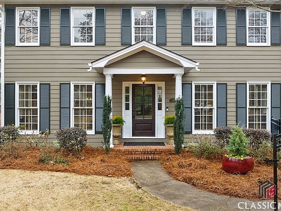 Upon entering the foyer, you will be greeted by a wide entry hall that stretches to the back of the home, and a stair case that leads to the upstairs bedrooms. The inviting foyer is flanked on the right by a spacious dining room flooded with natural light. A Butler's Pantry, complete with glass cabinets, granite counter tops, plenty of storage and a wine refrigerator connect the dining room and kitchen. To the left of the foyer is the cheerful living room also flanked with natural light, and anchored by a brick, gas burning fireplace and a banquet/breakfast room with built-ins that double as an office space overlooking the pristine back yard. The open kitchen boasts stainless steel appliances and granite countertops, white shaker cabinets with an abundance of storage. Upstairs you will find a Primary Bedroom with a sizeable walk-in closet and a Primary Bathroom with separate vanities, a wall of built-in cabinets and shelving, and a tiled walk in shower as well as a tiled soaking tub. Downstairs, walk out of the beautiful French doors into a spacious back yard with a substantial patio and dining area including a pergola attached to the two car garage. The main level has new wood flooring, and plantation shutters in the living and dining rooms.