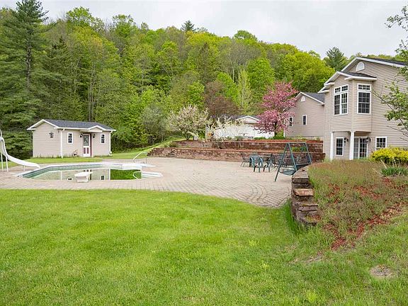 A breath of fresh air in the country sits this 3 bedroom, 3 bath bilevel ranch home planned with family in mind. Who wouldn't love the in ground pool with cabanna. The brick paver walks and patio are expertly landscaped with floral scents all around you. Apple blossoms adorn the front lawn of the home with brook, pond and waterfalls adding to the picturesque setting. The extremely spacious kitchen with top of the line appliances has solid wood cabinetry, with many glass front doors and granite countertops. Most windows throughout the home feature transom toppers to maximize light entry. The spectacular living room space with its cathedral ceiling and gas fireplace speaks relaxation. Attention was evident in every detail from the master bedroom suite woodwork too the bar in the rec room on the lower level. Spacious rooms and room to roam outdoors. Additional outbuilding garage is ready for all your vehicles. This property is ready for a family!