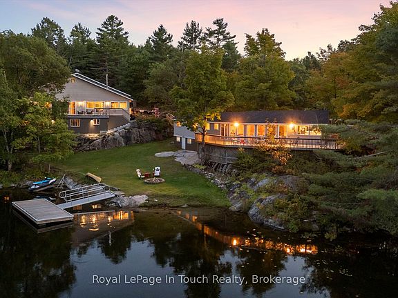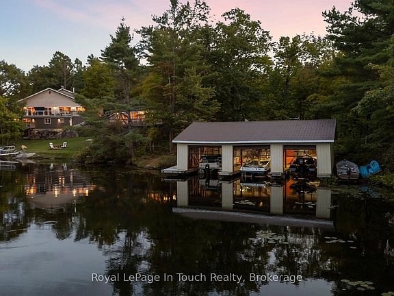 SIX MILE LAKE This is a Generational Cottage at 285 A & B Crooked Bay Road with 280 ft Frontage | 9 Bedrooms | 6 Bathrooms | 3 Kitchens| Boathouse with 2 Wet Slips + 1 Dry Slip | Garage | 2 Septic Systems. Welcome to an extraordinary multi-family lakeside retreat on picturesque Six Mile Lake, just 2 minutes off Exit 164 on Highway 400. This is a rare waterfront opportunity 2 fully equipped cottages set on a generous 280 feet of sandy shoreline, ideal for multi-generational living, shared ownership, or income potential.***THE DETAILS*** 3 in 2 Cottages with a combined 4,185 sq ft of finished living space + 805 sq ft crawlspace 9 Bedrooms | 6 Bathrooms Ample space for large families or guests. 3 Full Kitchens Designed for entertaining with ease. 2 Septic Systems Reliable and built for capacity of 2 Cottages. Bunkie Cottage (1,463 sq ft) with 930 sq ft of storage below. Boathouse (1,232 sq ft) with three slips (2 wet, 1 dry) Garage (535 sq ft) 20' x 23' for toys, tools, and vehicles. 280 ft of waterfront with a sandy beach and 5+ ft deep dockside water. Eastern exposure for brilliant sunrise. Bell internet service available***THE SETTING*** Only 2 minutes from Hwy 400 Perfect for weekend getaways or full-time cottage life. Located in a tight-knit community of long-time cottage families. Close proximity to two full-service marinas Set in the natural beauty of Six Mile Lake, known for its tranquility, family-friendly atmosphere, and easy boating. This property is not just a cottage as it sits, it is a compound-style lifestyle that brings generations together.