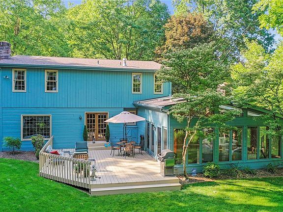 Stunning 50 year old young custom designed by Shamey & Rischia, AIA home & built by Adolf Kokoscenski 4 Bedroom, 2.5 bath home with 2 car garage situated on .63 of an acre at the end of a cul-de-sac. Spacious & Bright! Equipped Updated Cherry Kitchen, SS appliances, Granite Countertops, with wine cooler. Breakfast nook with vanilla cabinets & chocolate glaze & peek-a-boo doors. Formal Dining room with French doors to 500 sq foot deck. Formal Sunken Living Rm with wood burning gas log fire-place. Family room with Vaulted ceiling, wood burning gas log fireplace and built in bookshelves. Amazing Yr Round 10-1/2 ft Cathedral Sunroom floor to ceiling wall of windows, with 6 skylights. 1/2 bath & Laundry on main. Master suit with walk in closet & bath. Full bath & 3 additional bedrooms complete the 2nd floor. Plaster throughout. Professionally landscaped. Roof ‘17, Updated baths w/ Corian C-top vanities, c-tile floors.  Amazing parklike yard.