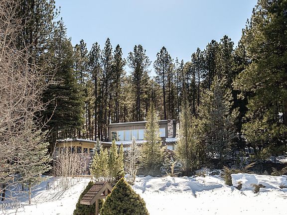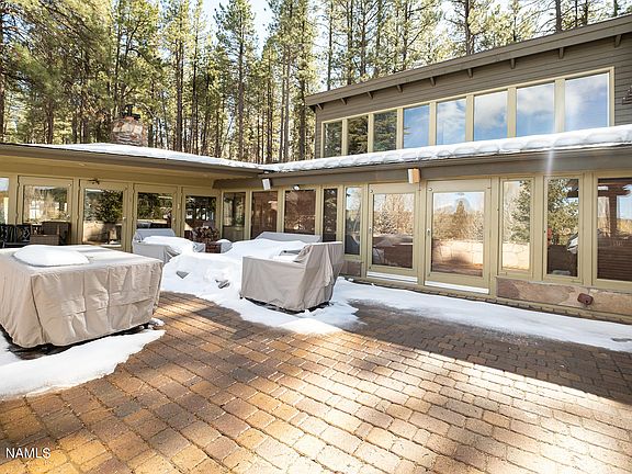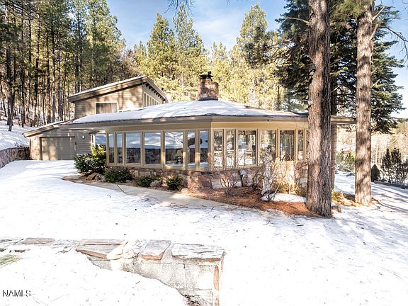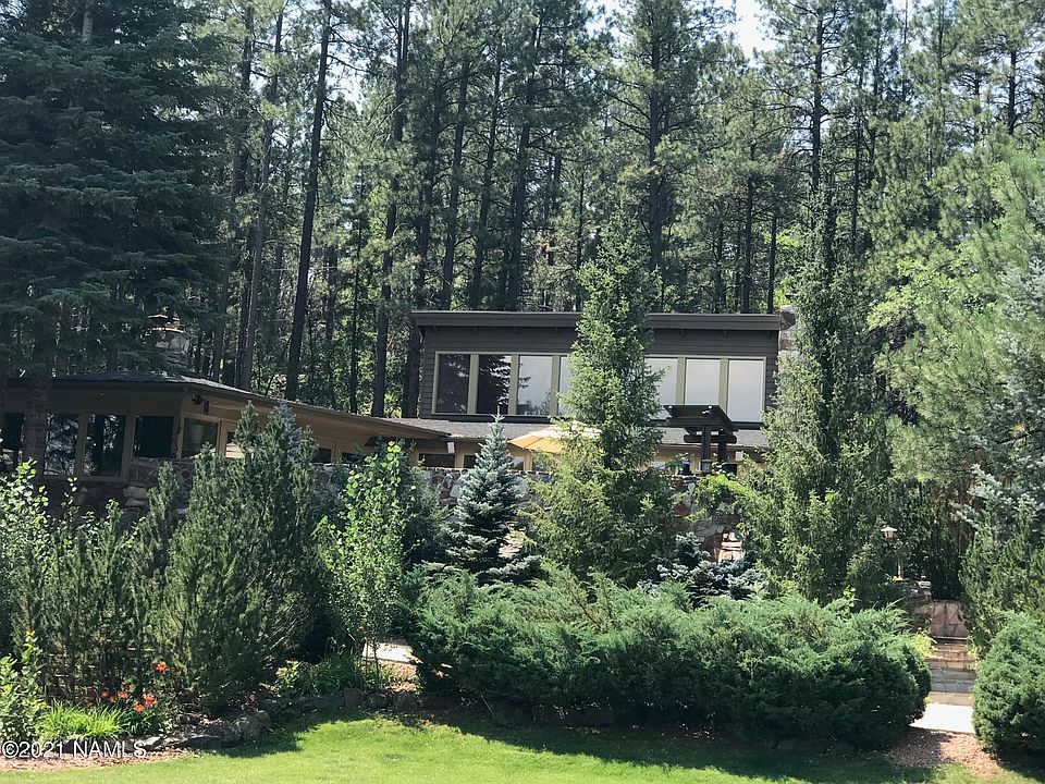 A bit of history for sale in Munds Park. One of the original homes built in Northern-Air and designed by acclaimed architect John Randall McDonald who studied alongside Frank Lloyd Wright. The home features an extensive brick patio with panoramic views overlooking Pinewood Country Club and views to the San Francisco peaks. Windows bank the North side of the home from the extensive round sunken living room to both main floor bedrooms. Extensive rock fireplace in the living room and a wood burning insert facing the kitchen. The addition includes a deep tandem car garage, family room/excercise room, utility room, upstairs office/bedrooms and an additional bath. The home has multiple thermostats that run different zones of the home. Upgraded kitchen with views, slate flooring, large