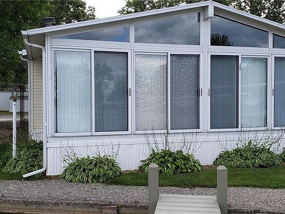 Welcome to the lake! This open concept, spacious floor plan has cathedral ceilings, large dining area, and a cozy fireplace for the chilly days. See the lake from your kitchen window. This home features a large sunroom (24x12) and livingroom with a great view of the lake. The resort has a swimming pool for your enjoyment. It also provides mowing, sewer and supplied water. Also included is a new spacious storage building for all of the equipment for tubing and boarding fun, or extra lawn furniture. Shed was purchased last year. A carport also offers protection from the weather. This is an immaculate, well maintained unit. Carpet allowance can be negotiated. Original family owner has full spreadsheet of any repairs or changes since purchase. There is also a 2 sided pier directly in front of this unit for your boats or waverunners. The cost for dock rent is $550 per year. Make this one your home! Includes a home warranty up to $350.(Leased lot. $565 monthly plus water/sewer $42/month)