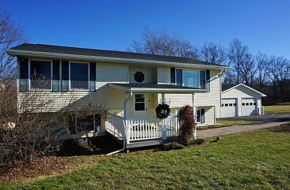 Country home just south of Ithaca on 4.5 acres with far reaching views taking in sunsets and distant hills. Flexible floor plan offering 2 - 3 bedrooms and 2 full baths. Large master suite with double closet and master bath. Open living/dining/kitchen floor plan with hardwood floors, updated maple cabinets, stainless steel appliances, center island with breakfast bar and lots of sun. Tiled bath, laundry and mudroom in walk out lower level. 11 x 11 covered front porch plus private deck overlooking woods. Expansive side yard for many activities. 24 x 26 heated garage and a blacktop driveway.